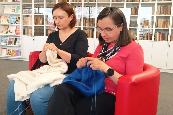 Kwietniowe spotkanie było okazją, by zobaczyć, jak daleko zaszły prace nad swetrami robionymi metodą raglanu od góry. Uczestniczki mają już za sobą sporą część korpusu, więc robótki zaczynają nabierać prawdziwego charakteru. Druty idą szybko, oczko za oczkiem, a całość coraz wyraźniej układa się w gotowe ubrania.