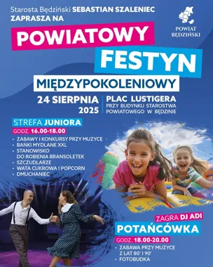 Powiatowe spotkanie dla mieszkańców różnych pokoleń odbędzie się w niedzielę 24 sierpnia 2025 roku na placu Lustigera przy budynku Starostwa Powiatowego w Będzinie. Wydarzenie ma charakter rodzinny i przewidziano program zarówno dla dzieci, jak i dorosłych, tak aby uczestniczyły w nim całe rodziny i sąsiedzi.